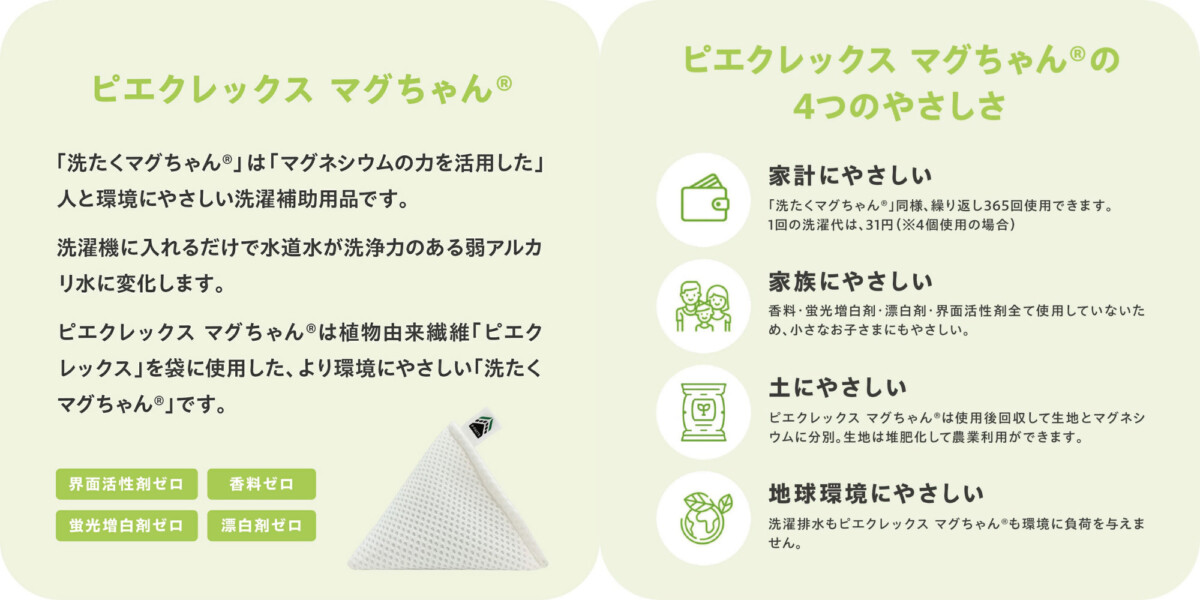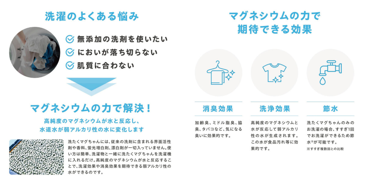 「洗たくマグちゃん」は、マグネシウムの力を活用した洗濯補助用品で、